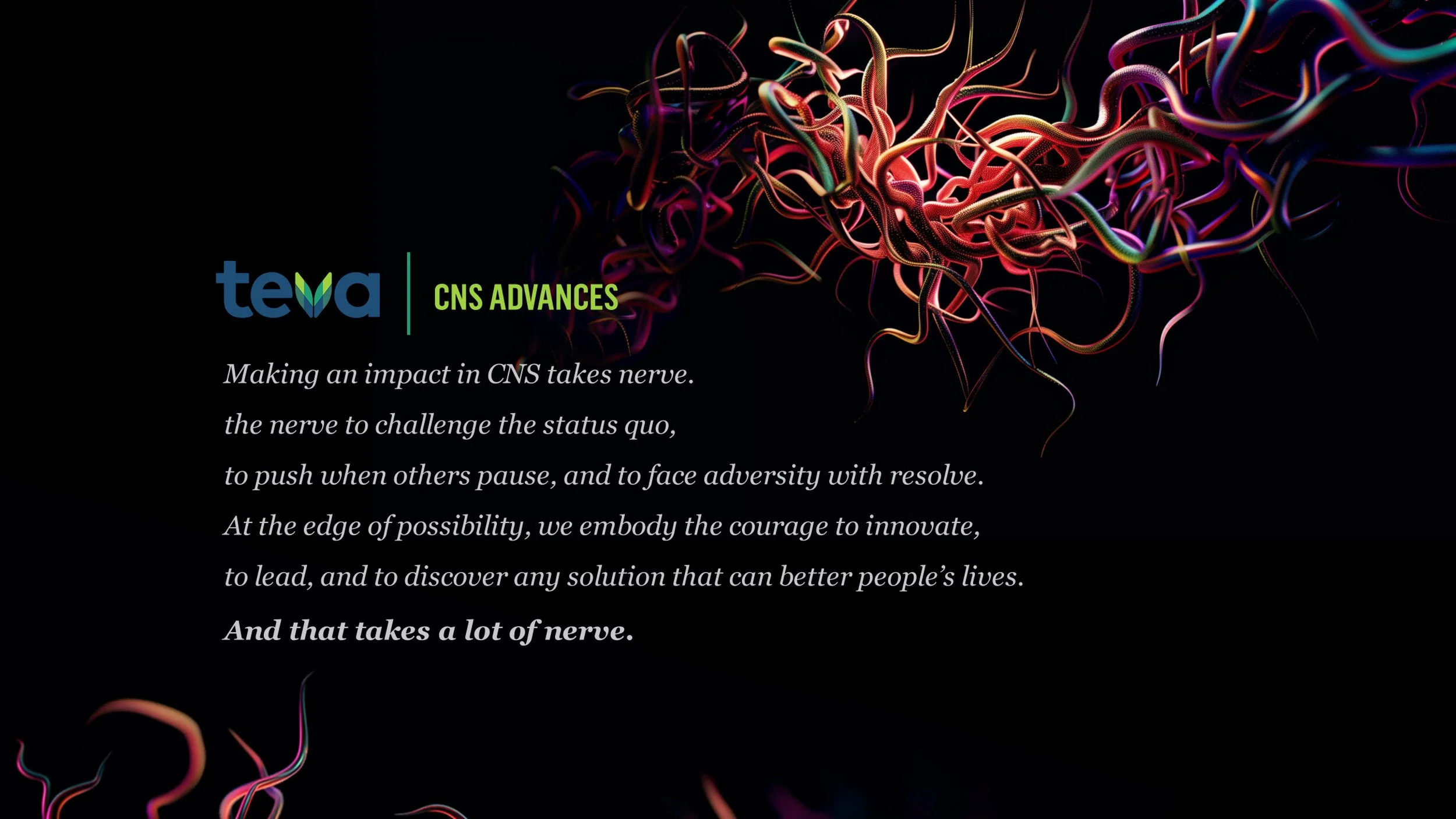 Advancing care in central nervous system disorders takes more than expertise—it takes nerve. That idea became the foundation of this campaign for Teva, positioning progress in CNS as an act of courage, resilience, and determination. It Takes Nerve captures the spirit of pushing beyond barriers, challenging what exists, and pursuing innovations that can meaningfully improve people’s lives.