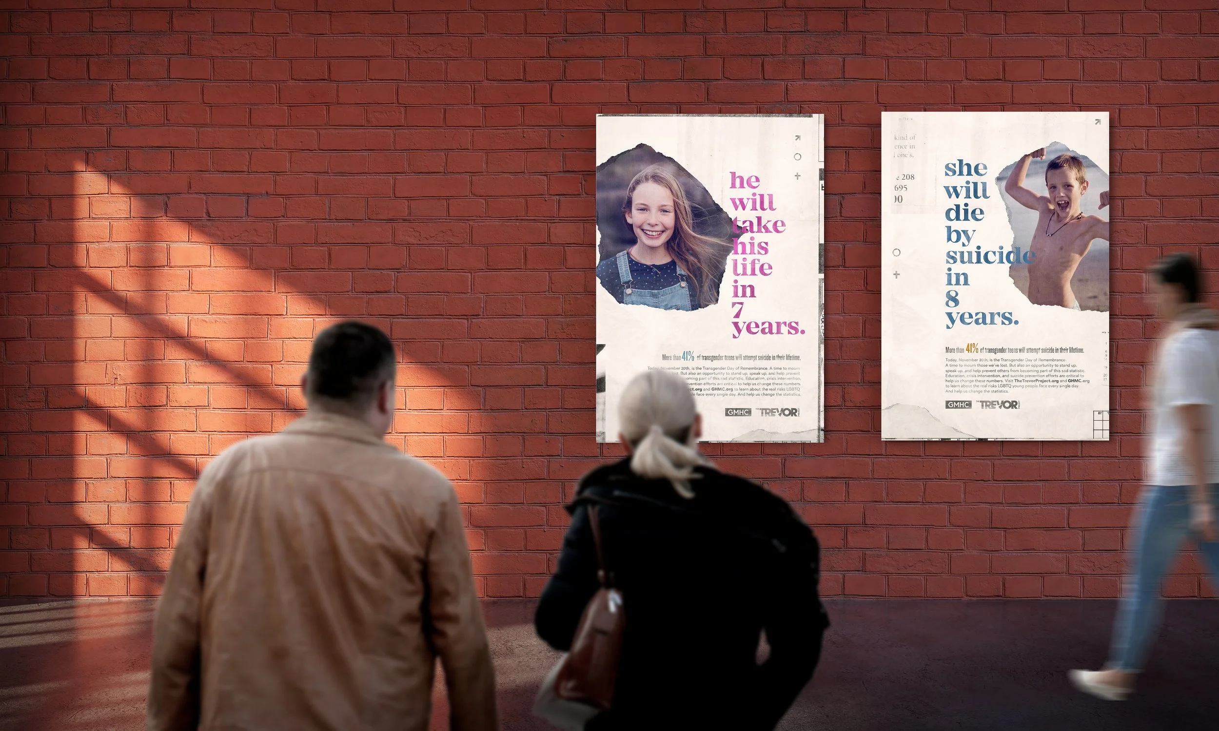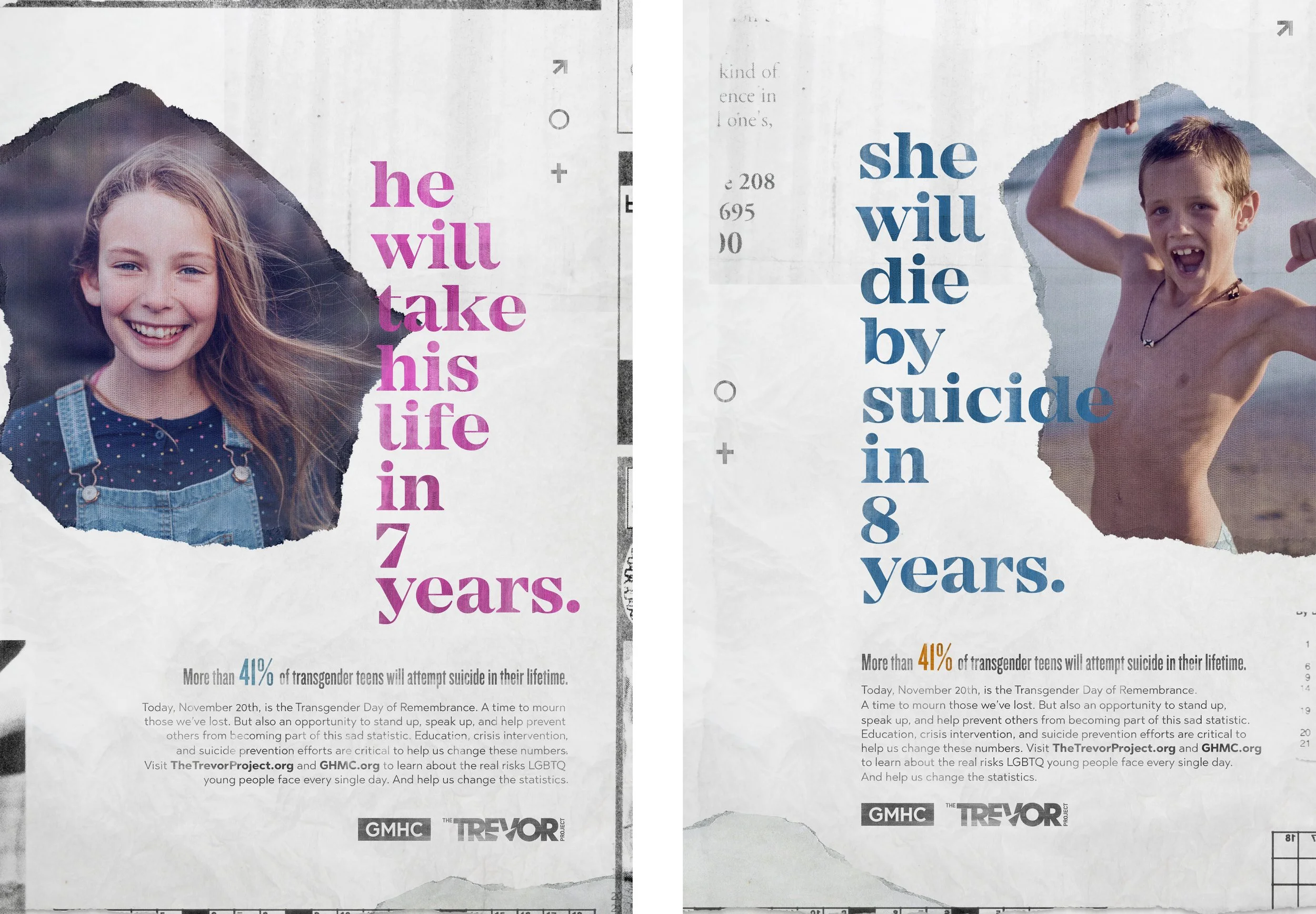 With transgender youth facing alarmingly high rates of attempted suicide, this campaign was created to bring urgent attention to a crisis too often overlooked. By featuring real transgender teens who lost their lives, the work challenges preconceived notions of gender while forcing viewers to confront the devastating reality behind the statistic. The goal was to drive at-risk teens to the Trevor Lifeline, where 24/7 support could help change the outcome.